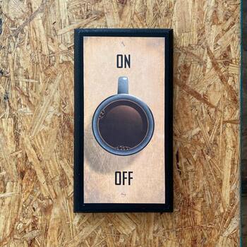 A small framed print picked up from CrestField on Etsy: a stylized light-switch plate where the toggle is a mug of coffee, flipping between ON and OFF. It is...