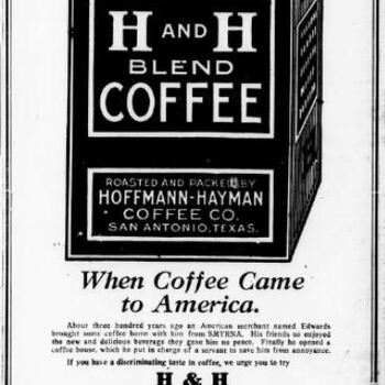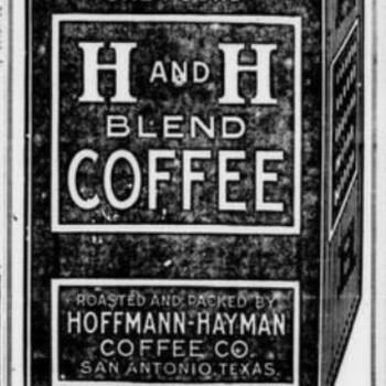 This 1920 San Antonio Evening News piece leads with a drawn one-pound H AND H BLEND COFFEE tin “ROASTED AND PACKED BY HOFFMANN-HAYMAN COFFEE CO. SAN ANTONIO,...